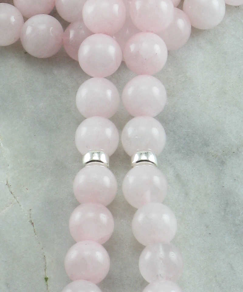 The design of this mala was inspired by a yoga practice for opening the heart. It combines mala beads that promote love and acceptance. The rose quartz mala beads have a delicate color and smooth texture. The sterling silver is used to bring out the elegance of the dove pose guru bead. The guru bead was selected for its symbolism of opening the body to love and grace. It is a delicate piece, and is well proportioned with the Buddhist prayer beads. The guru offers an elegant focus point. The mala beads are strung on premium wire. The colors of this mala are light, clean, and beautiful. Adequate spacing is given between each stone for ease of use during meditation. Watch the yoga practice that inspired this design.